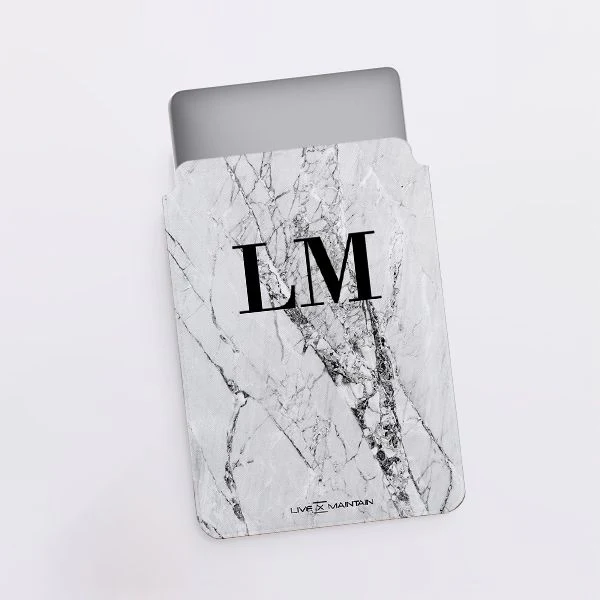 Personalised Cracked White Marble Initials Saffiano Leather Tablet/Laptop Sleeve
